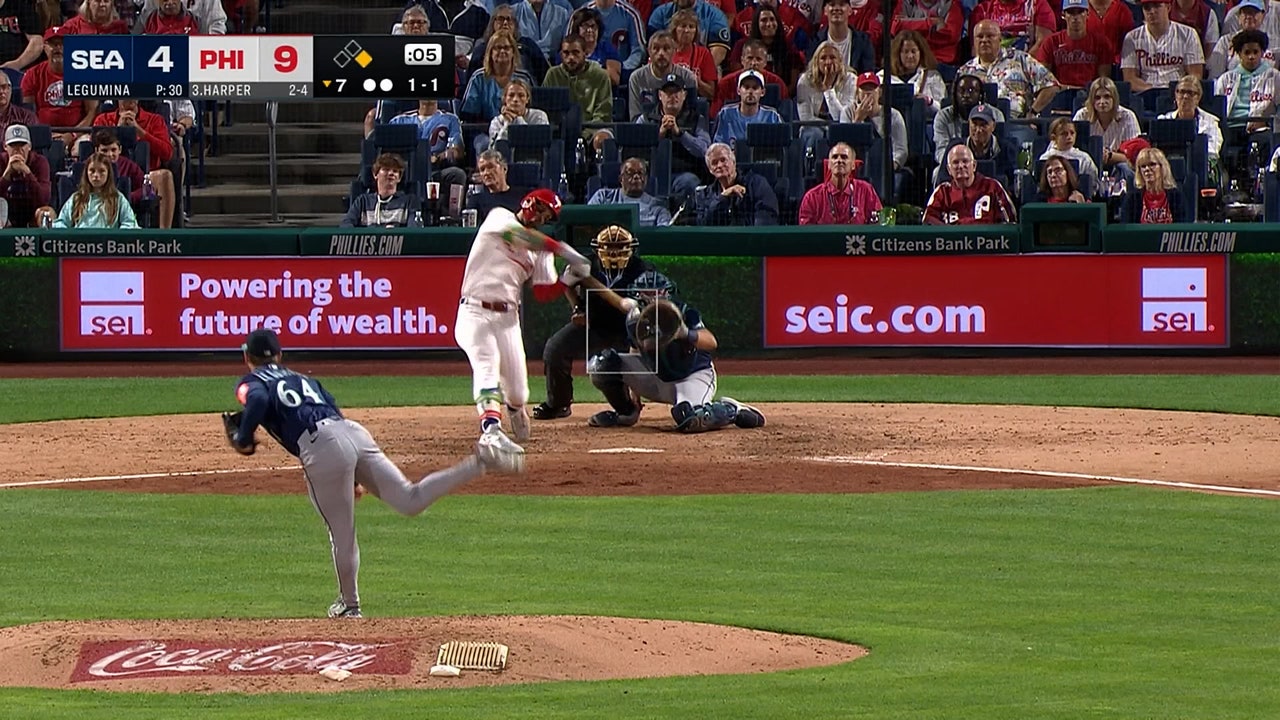 Bryce Harper knocks his second homer of the game, extending Phillies' lead over Mariners