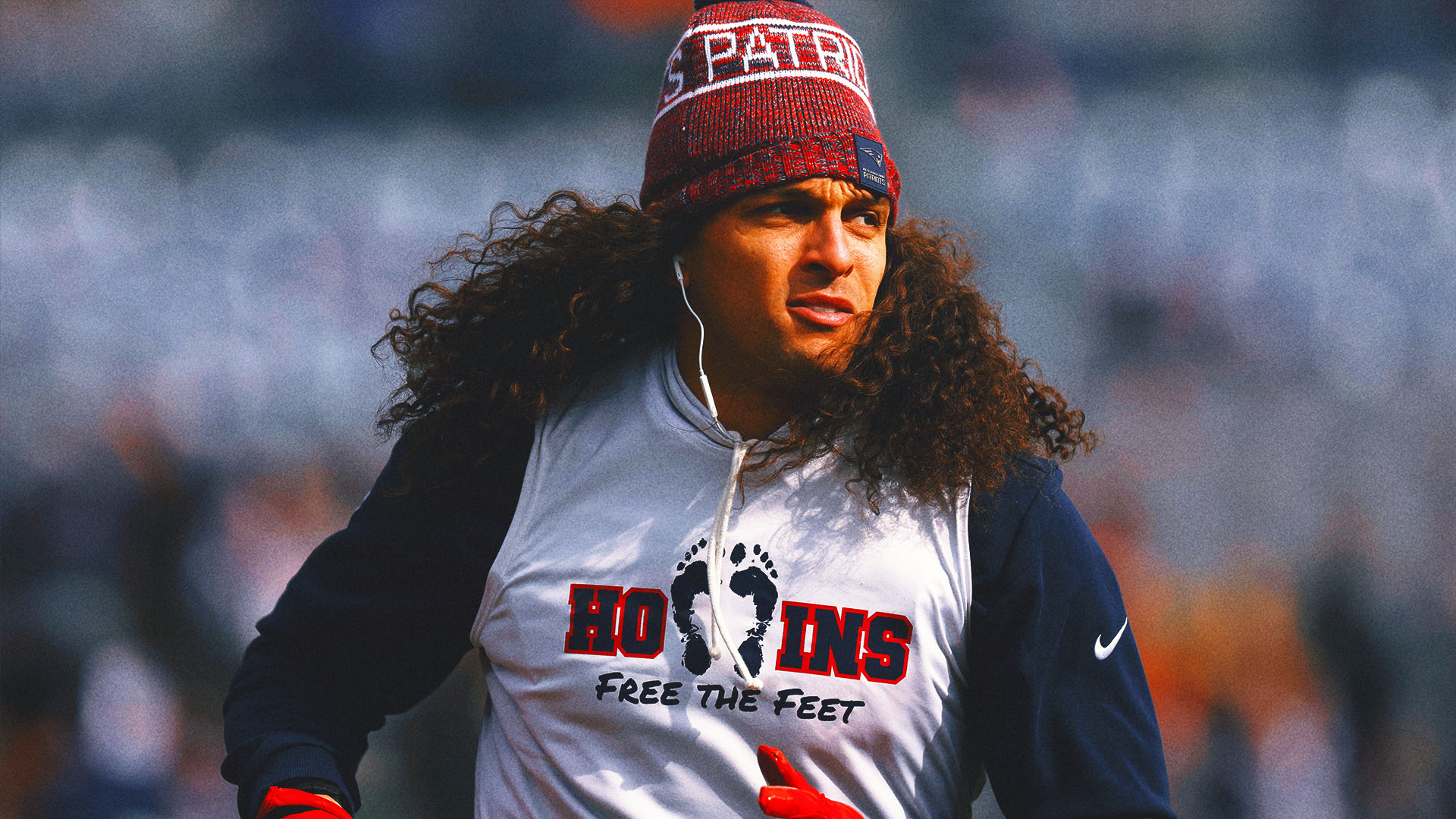 With his ritual of walking barefoot around the field before games and his creative game-day outfits arriving to the stadium, Hollins has gained notoriety as a sideshow attraction to New England’s Super Bowl run.Â